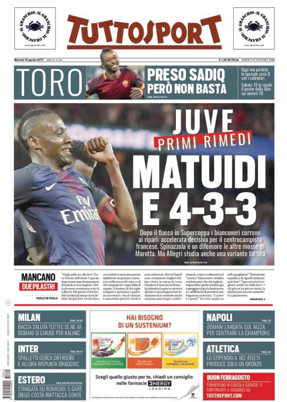Ecco le prime pagine dei principali quotidiani sportivi, in edicola domattina. TuttoSport mette in primo piano l’accelerata della Juventus per Matuidi, e lo stesso fa il Corriere dello Sport. Su entrambi i quotidiani, tuttavia, c’è spazio per la grande ed imminente sfida tra Napoli e Nizza. Di seguito, le anteprime.