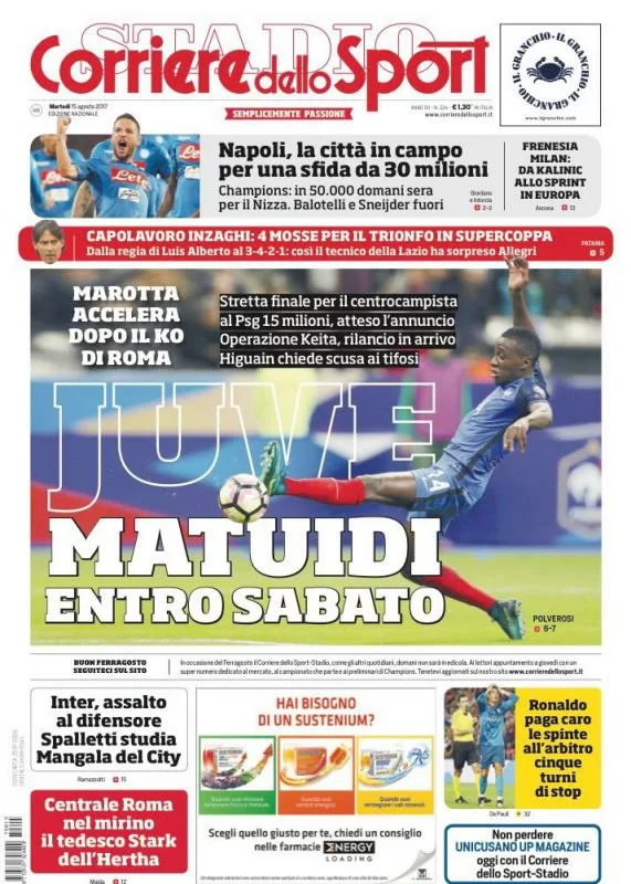Ecco le prime pagine dei principali quotidiani sportivi, in edicola domattina. TuttoSport mette in primo piano l’accelerata della Juventus per Matuidi, e lo stesso fa il Corriere dello Sport. Su entrambi i quotidiani, tuttavia, c’è spazio per la grande ed imminente sfida tra Napoli e Nizza. Di seguito, le anteprime.