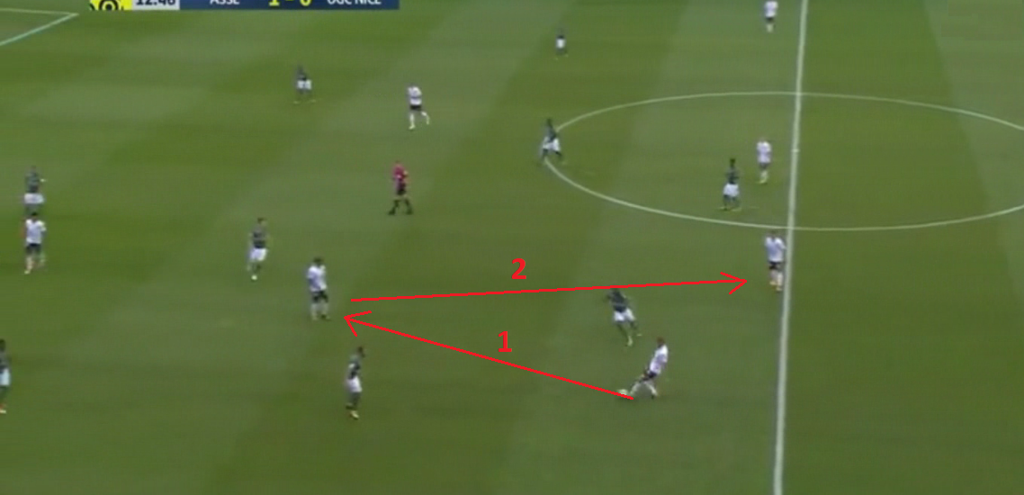 Superato il primo possesso basso, il Nizza basa su tre opzioni lo sviluppo successivo della manovra offensiva: 1) continui cambi di gioco per creare superiorità numerica in corsia laterale; 2) imbucate centrali per i tre trequartisti che si abbassano per ricevere sul corto; 3) scorrimenti orizzontali in zone alte per arrivare all’1vs1 in fascia: