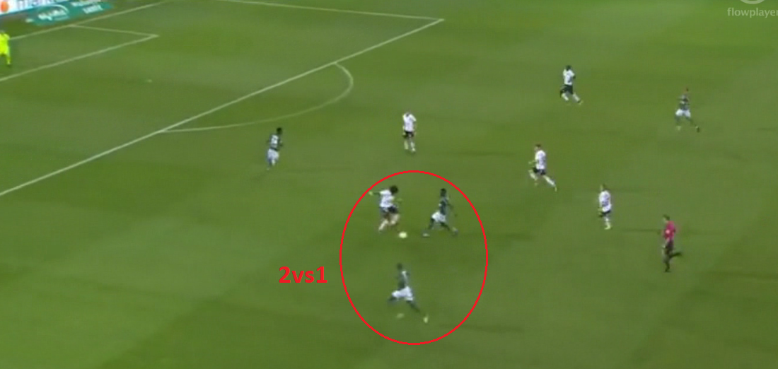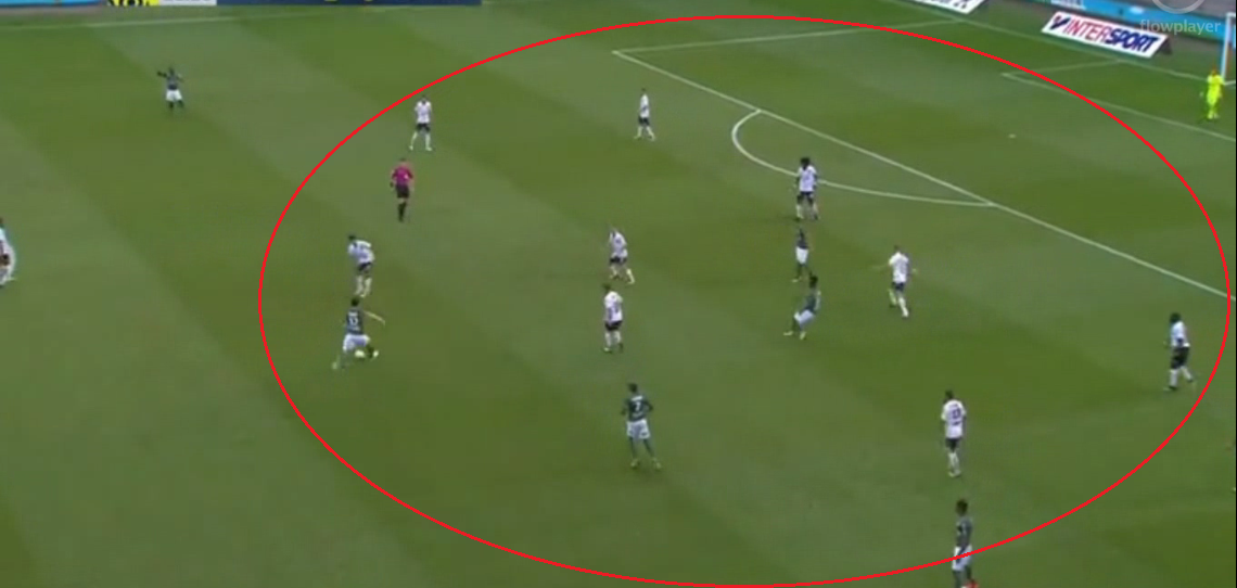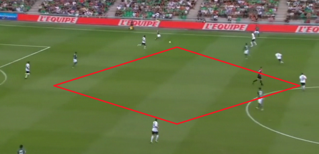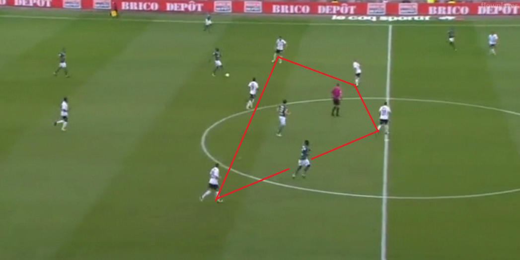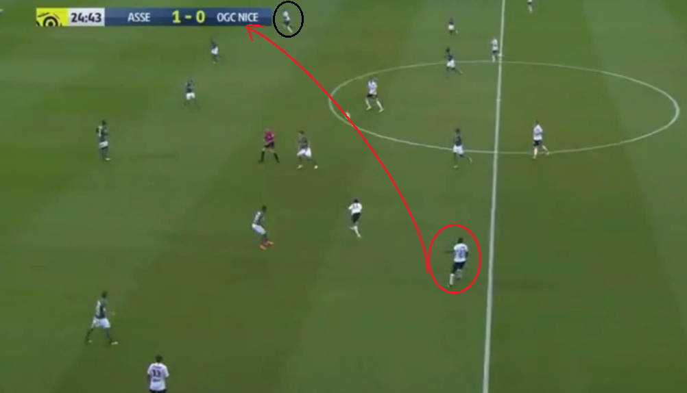 Conseguenza di ciò è il 2vs1 creatosi tra Dante e due avversari del Saint-Etienne (cerchio rosso)