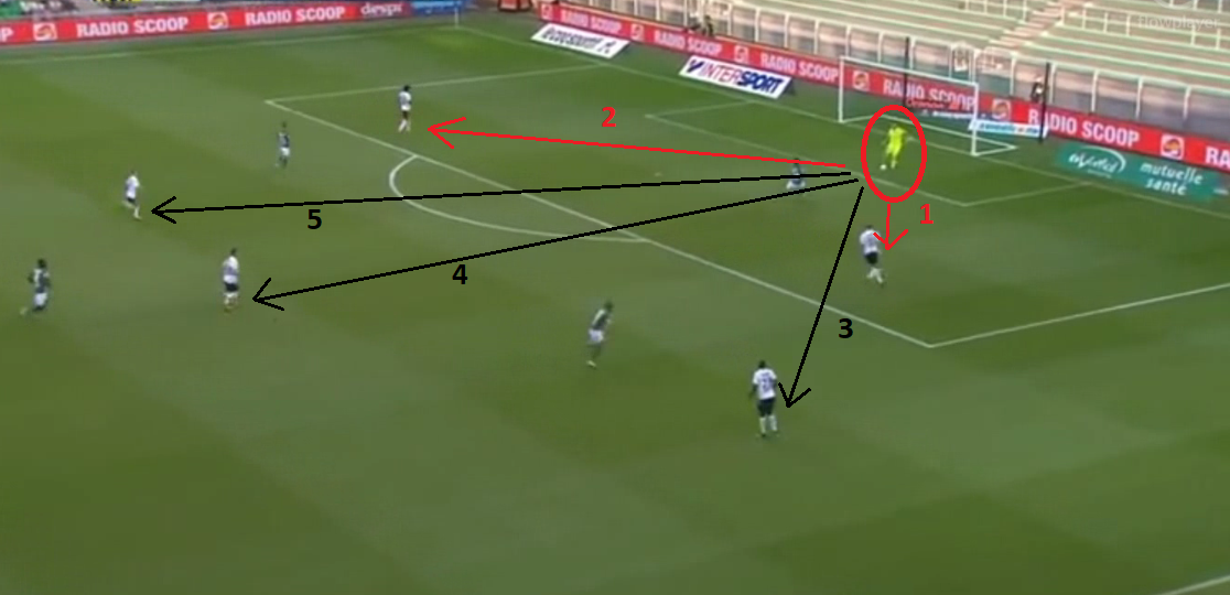 Con palla al portiere (cerchio rosso), si creano immediatamente cinque possibili soluzioni di passaggio. Le frecce rosse 1 e 2 rappresentano le migliori soluzioni a disposizione del portiere, mentre le frecce nere 3-4-5 sono soluzioni molto più rischiose