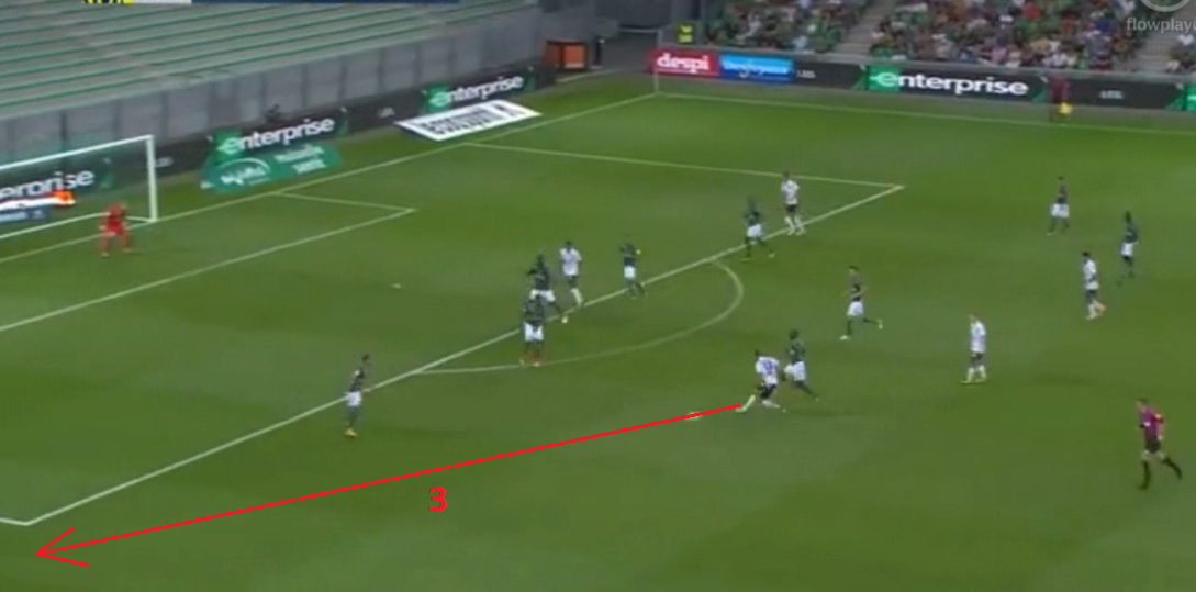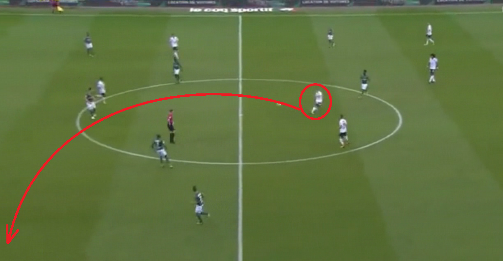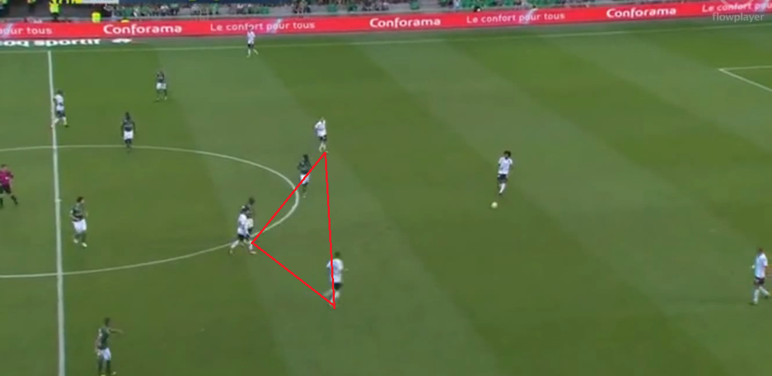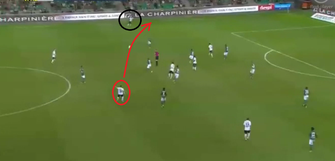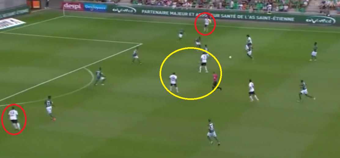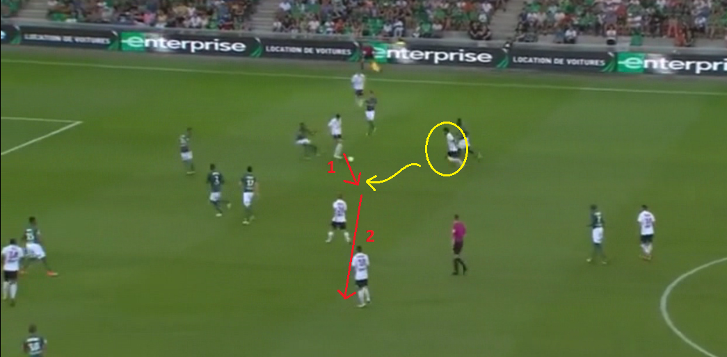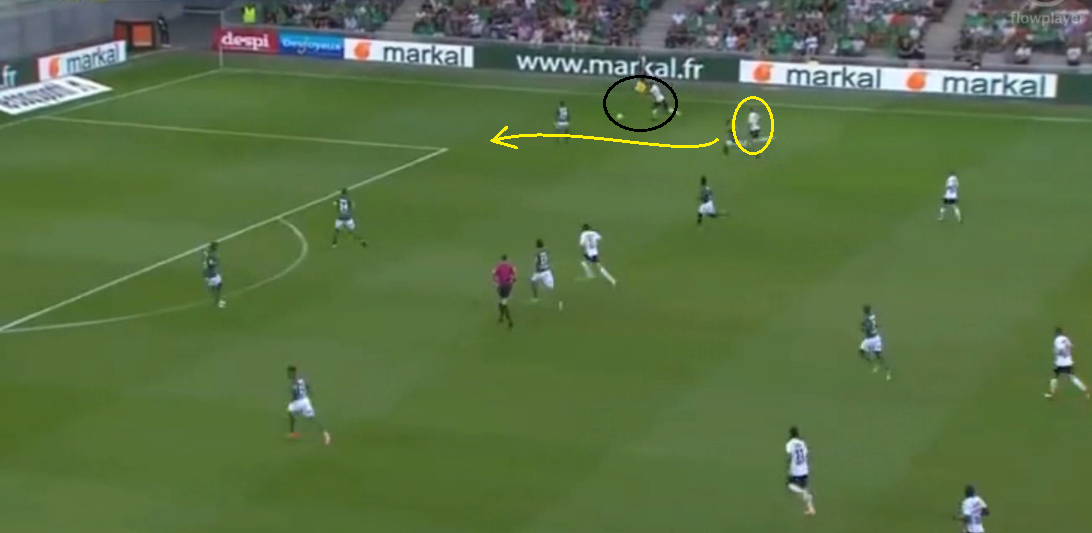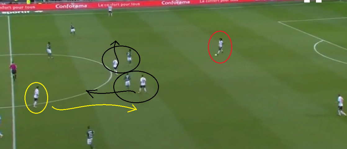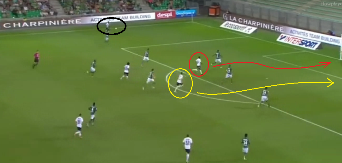 Si crea un 2vs2 tra l’attaccante (cerchio nero) in possesso palla, e il terzino (cerchio giallo) che si inserisce (freccia gialla) con un taglio, contro i due difendenti del Saint-EtienneCambio di gioco (freccia rossa) utilizzato anche per “liberare” i terzini (cerchio nero) al crossSul cross del terzino (cerchio nero), l’attaccante centrale e il trequartista centrale (cerchi rosso e giallo) attaccano primo e secondo palo (frecce rossa e gialla)