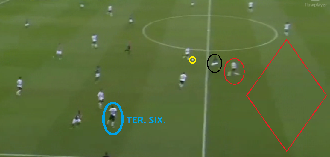 Linee e reparti stretti e compatti (linee rosse). Unico a restare dietro la linea della palla è l’attaccanteLa linea di difesa (linee rosse) tende a restare compatta: il terzino destro non si sgancia dalla linea per andare a contrastare il possessore avversario (cerchio nero)