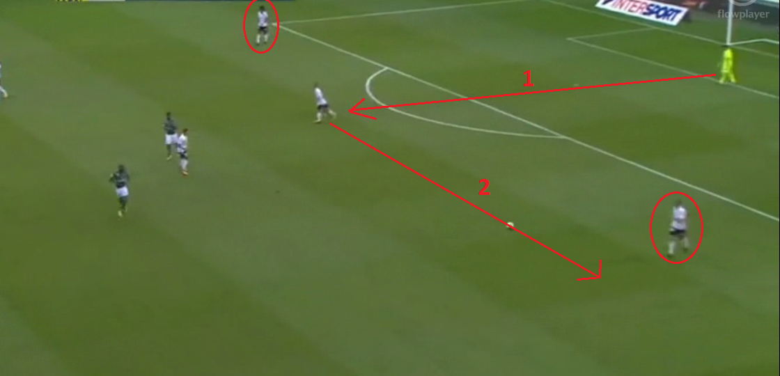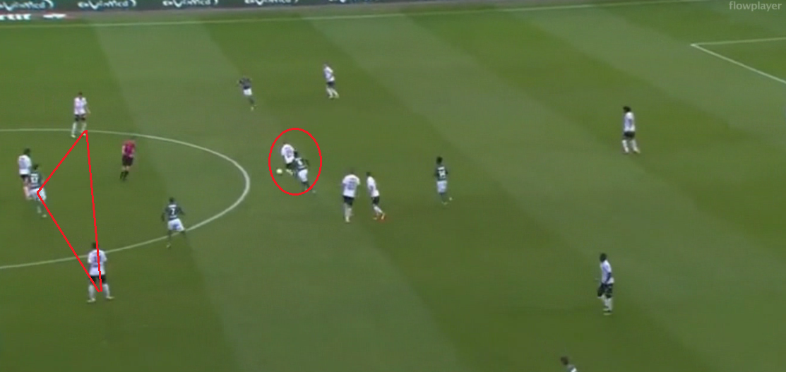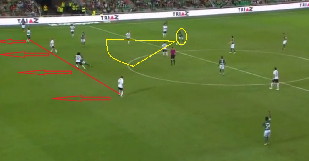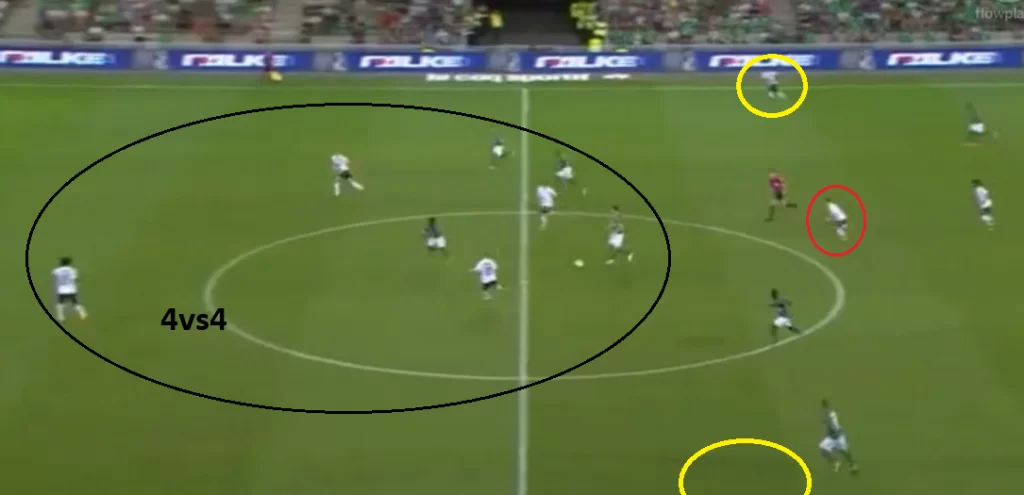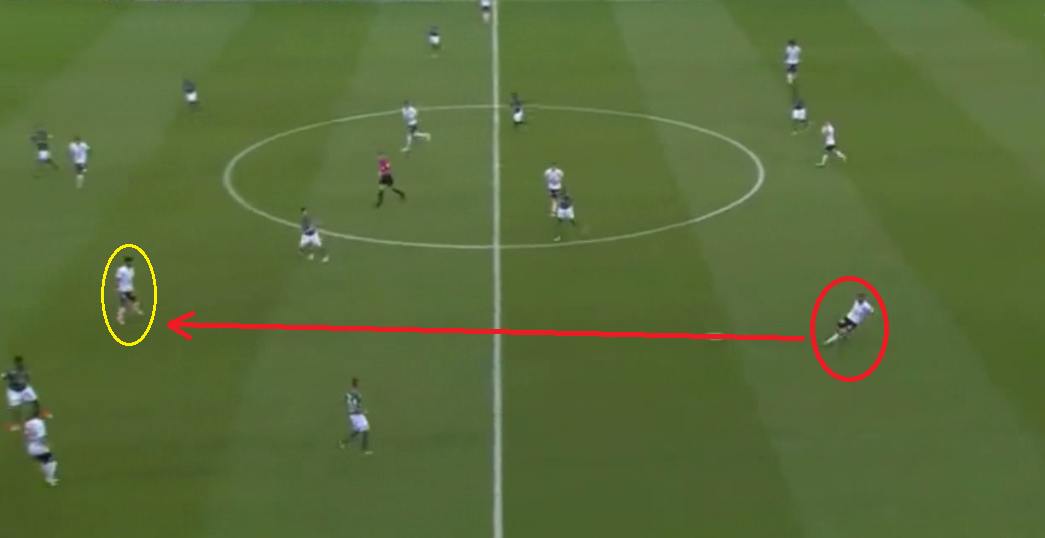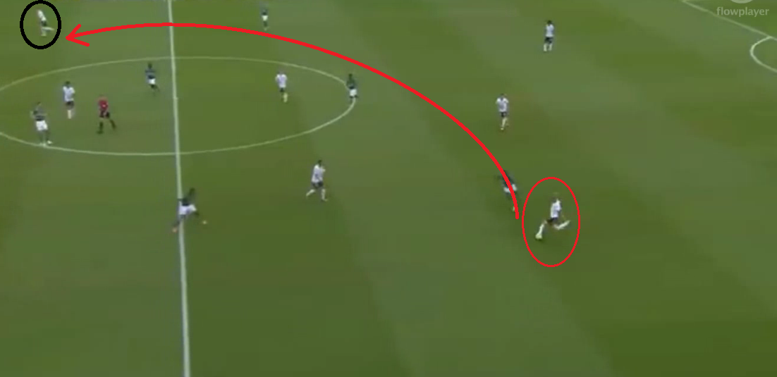 Cambi di gioco (freccia rossa) per andare ad attaccare il lato debole degli avversari, e per creare quindi duelli 1vs1, 2vs1, 2vs2