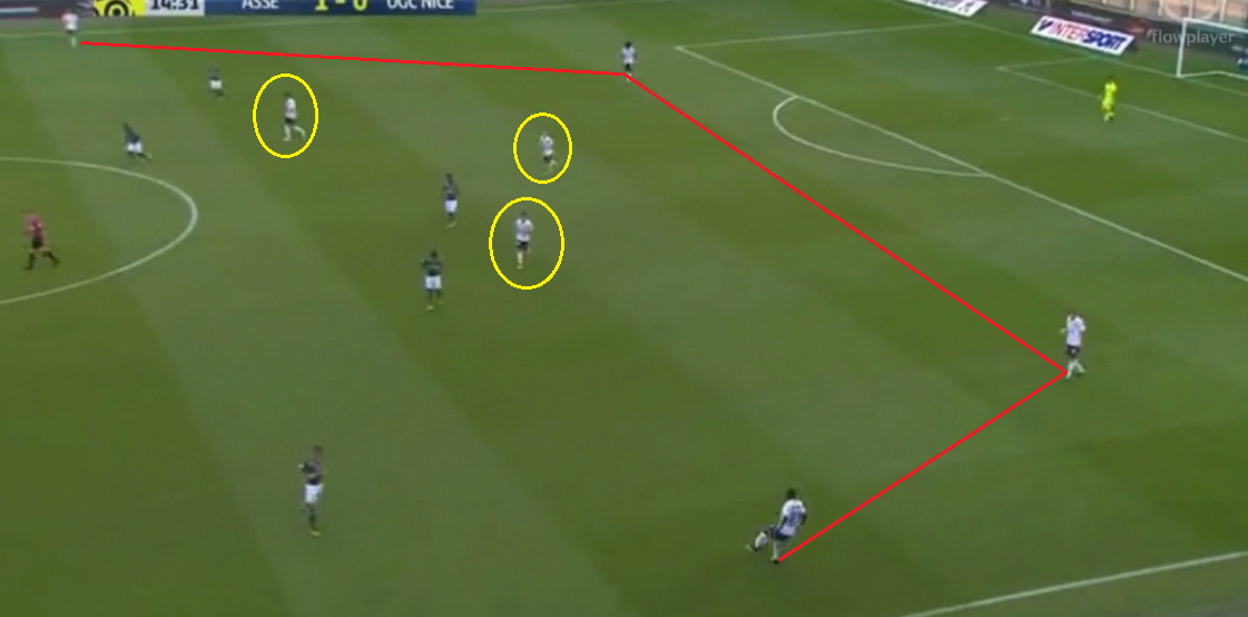 Trequartista centrale e attaccante si allineano (cerchio giallo) per costruire le figure geometriche in cui far scorrere la palla. I due trequartisti esterni larghissimi (cerchi rossi)Lo scorrimento palla rapido nelle figure geometriche centrali (cerchio giallo) porta a liberare (freccia gialla) l’esterno alto del Nizza (cerchio rosso) creando, così, l’1vs1 in corsia laterale