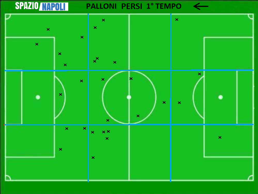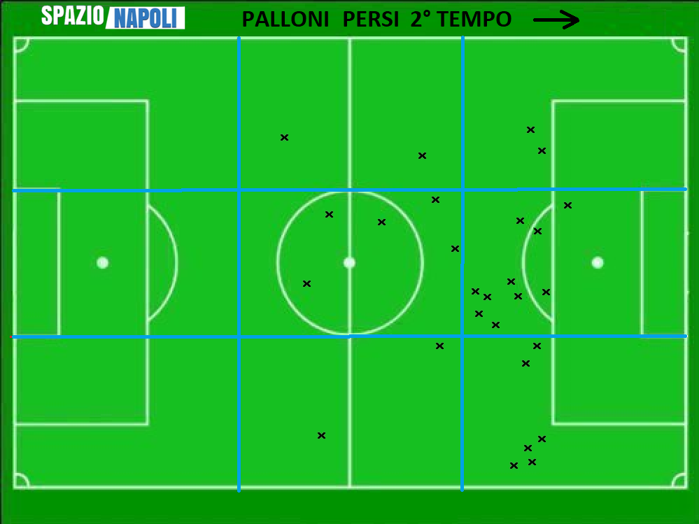 Conseguenza del tempo che si riduce e quindi delle possibilità di recuperare il match che si dimezzano sono anche i palloni persi. Se nel primo tempo il Nizza perde tanti possessi anche in zone medio-basse, nella ripresa, con l’intensità di gioco nella metà campo avversaria che aumenta, gli uomini di Favre perdono tantissimi palloni in zone altissime, e quasi esclusivamente zone centrali. Questo dato è significativo: è, infatti, in quelle zone che il Nizza prova a sviluppare il gioco e a creare le rifiniture giuste per andare a rete: