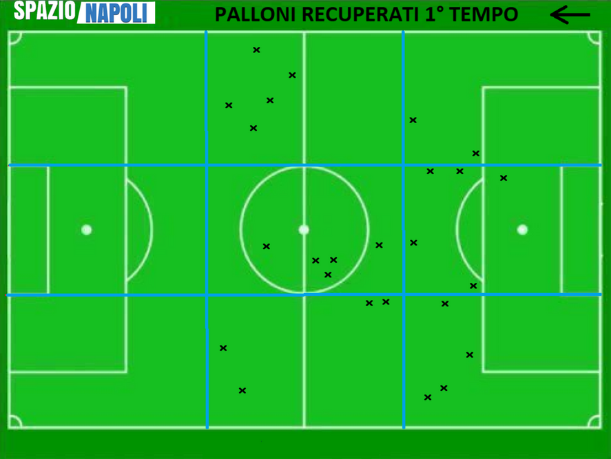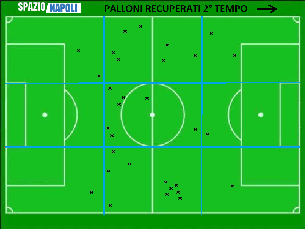 Conseguenza di questo atteggiamento è un recupero palla quasi esclusivamente ottenuto in zone medio-basse, mentre si va al recupero palla in zone più alte se la squadra è sotto nel punteggio e il tempo si riduce. Le due slide lo dimostrano alla perfezione: