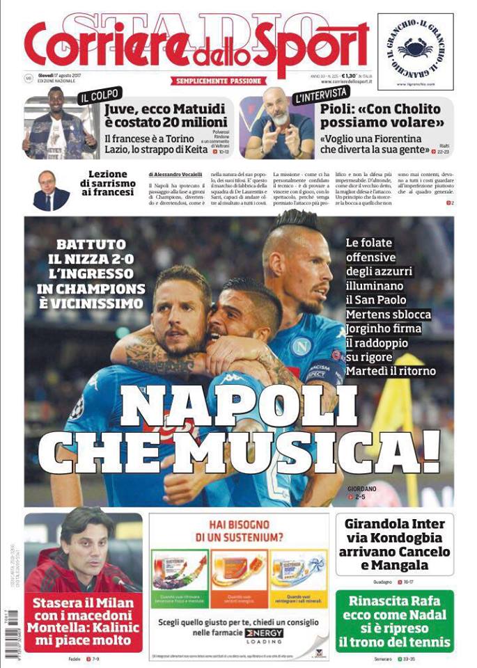 Apre con il Napoli il Corriere dello Sport. Prima pagina dedicata agli azzurri e alla vittoria per 2-0 contro il Nizza. “Napoli, che musica!” Scrive l’edizione di domattina del noto quotidiano – “Le folate degli azzurri illuminano il San Paolo. Mertens sblocca, Jorginho raddoppia su rigore. Martedì il ritorno”.