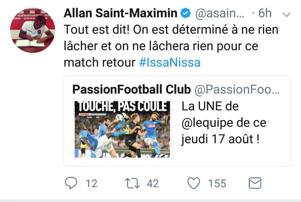 Tutti compatti, uniti i giocatori del Nizza nel comunicare l’atmosfera che si respira dalle loro parti: determinazione. Dopo il messaggio del capitano Dante, anche Saint-Maximin si affida ai social per esprimere il suo stato d’animo dopo il match col Napoli. I giocatori sono dunque agguerriti per il ritorno del preliminare di Champions League.