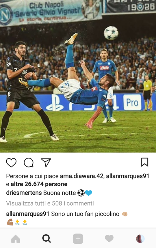 Quest’ultimo, infatti, ha caricato l’immagine della rovesciata provata ieri durante Napoli-Nizza, per dare una buonanotte particolare ai tifosi. Subito sotto la risposta dell’ex Udinese che ha scritto: “Sono un tuo fan piccolino”.