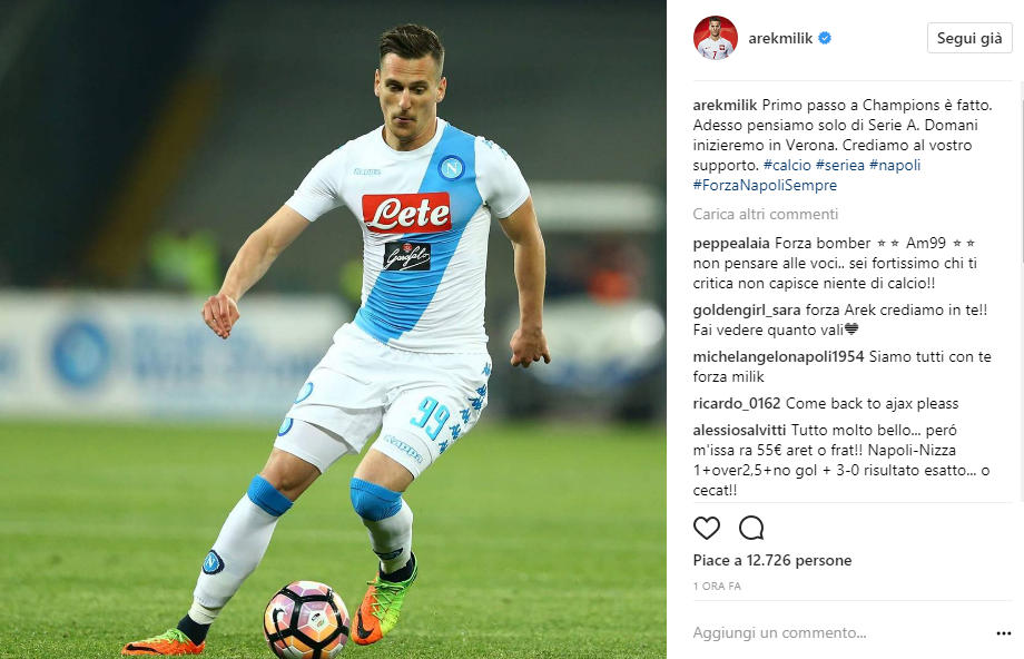 Con una foto sul suo profilo Instagram, il polacco suona la carica in vista della prima di campionato, ed incita i tifosi nel supportare i colori azzurri al Bentegodi: “Primo passo per la Champions è stato fatto. Adesso pensiamo solo alla Serie A. Domani inizieremo a Verona. Crediamo nel vostro supporto”.