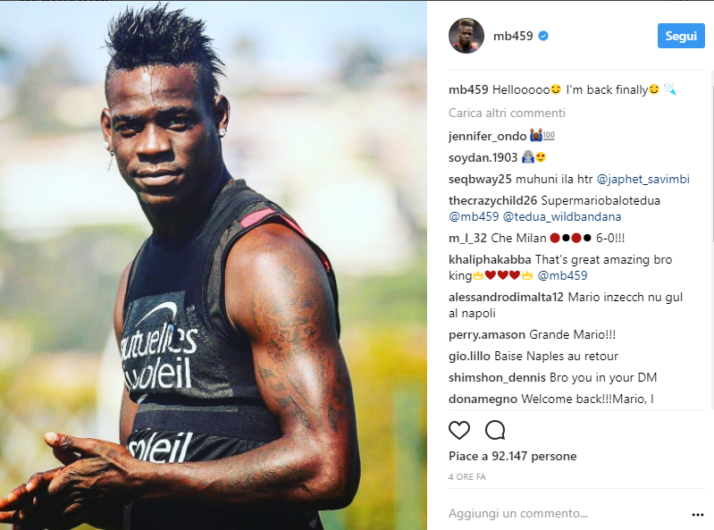 Segue la scia dei compagni Mario Balotelli, che sul suo profilo Instagram lancia un ulteriore messaggio implicitamente rivolto al Napoli. “Sono finalmente tornato“, si legge nella didascalia che accompagna lo scatto postato.