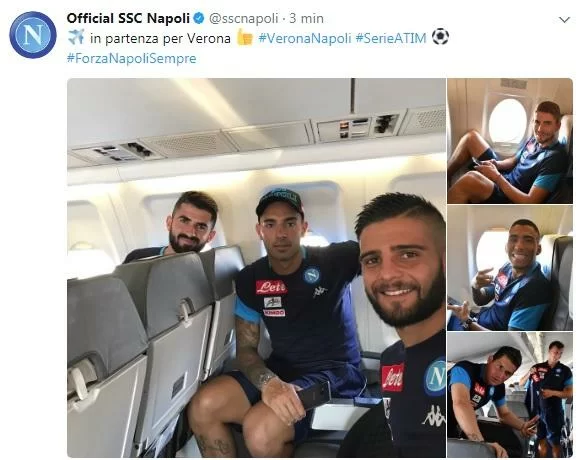 È in partenza il Napoli per Verona. I calciatori azzurri sono infatti appena saliti sull’aereo che li porterà nella città veneta per disputare la sfida di domani sera che segnerà l’esordio nel nuovo campionato di Serie A.