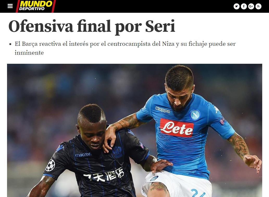 Gli azzurri, dopo aver vinto 2 a 0 l’andata al San Paolo, partono assolutamente favoriti, ma il pallone, è risaputo, è rotondo e nel calcio può succedere sempre qualsiasi cosa. Proprio in vista del match di ritorno con il Nizza, arrivano dalla Spagna buone notizie per il Napoli. Secondo Mundo Deportivo, infatti, il centrocampista del Nizza Seri sarebbe in procinto di lasciare la costa azzurra e trasferirsi proprio in Spagna, tra le fila del Barcellona, che lo sta cercando con molta insistenza per rinforzare la sua mediana. Il trasferimento è imminente e probabilmente, quindi, il centrocampista ivoriano non dovrebbe affrontare gli azzurri nel ritorno che si disputerà in terra francese.