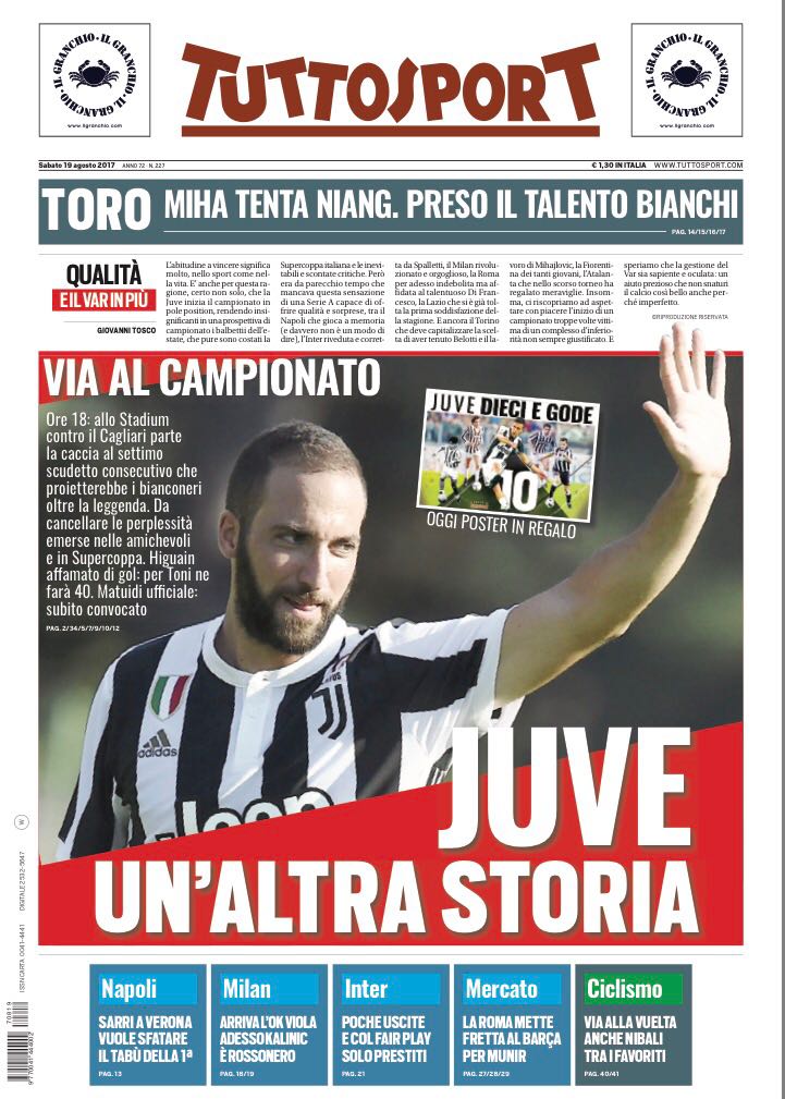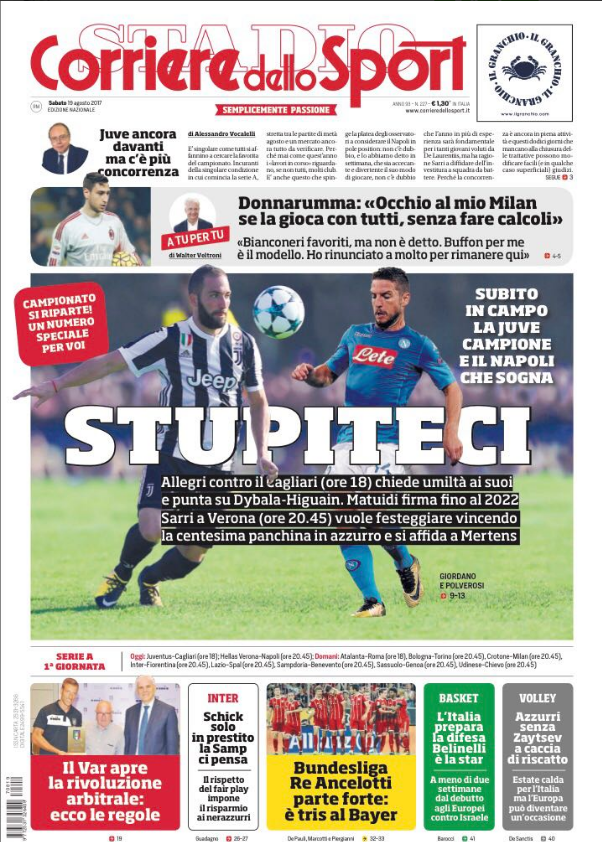 Ecco le prime pagine dei principali quotidiani sportivi, in edicola domattina. TuttoSport dedica ampio spazio alla Juventus, ma sulla prima pagina del quotidiano c’è anche spazio per un riferimento al Napoli: a Verona, infatti, gli azzurri proveranno a sfatare il tabù della prima giornata di campionato. Il Corriere dello Sport, invece, lancia l’appello alle due squadre, ovvero quello di stupire tutti. Di seguito, le anteprime.