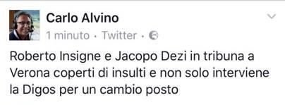 Ma non finisce qui. Il pubblico di casa, infatti, avrebbe ricoperto di insulti gli ex giocatori del Napoli Dezi ed Insigne Jr. presenti allo stadio, costringendo le forze dell’ordine a provvedere per un cambio di posto in tribuna. Di seguito, il tweet che conferma la notizia.