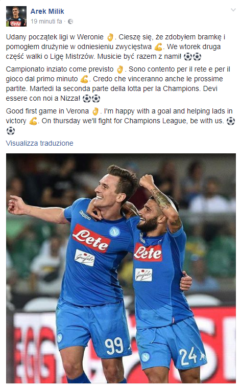 Arek Milik è tornato. Dopo la splendida rete con il Verona, l’attaccante polacco sembra aver riconquistato la fiducia nei propri mezzi e, di conseguenza, sembra aver smaltito qualsiasi ansia legata all’ormai vecchio ricordo dell’infortunio al ginocchio. Il tutto è testimoniato da un messaggio pubblicato dallo stesso giocatore sulla propria pagina Facebook: “Campionato iniziato come previsto. Sono contento per la rete e per aver giocato dal primo minuto. Credo che vinceremo anche le prossime partite. Martedì la seconda parte della lotta per la Champions”.