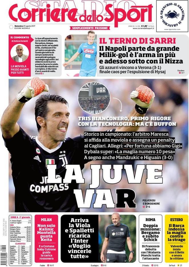 Il Corriere dello Sport apre con: “La Juve var“, facendo anche un gioco di parole sulla vittoria dei bianconeri contro il Cagliari. In taglio alto spazio al Napoli: “Il terno di Sarri“. In basso ecco le milanesi, la Roma ed il calcio estero con i vari campionati europei.