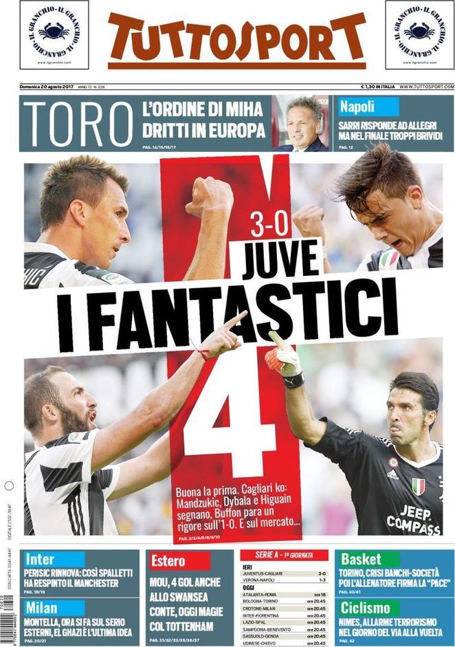 Le prime pagine dei quotidiani sportivi si concentrano sugli anticipi della prima giornata di Serie A che hanno visto la Juve battere il Cagliari (3-0), e il Napoli avere la meglio del Verona (1-3). Non mancano riferimenti anche al calciomercato.