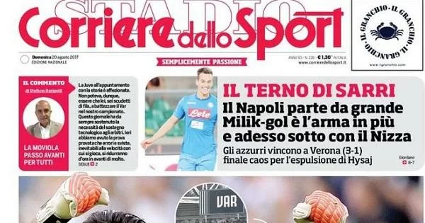 Il Corriere dello Sport apre con: “La Juve var“, facendo anche un gioco di parole sulla vittoria dei bianconeri contro il Cagliari. In taglio alto spazio al Napoli: “Il terno di Sarri“. In basso ecco le milanesi, la Roma ed il calcio estero con i vari campionati europei.