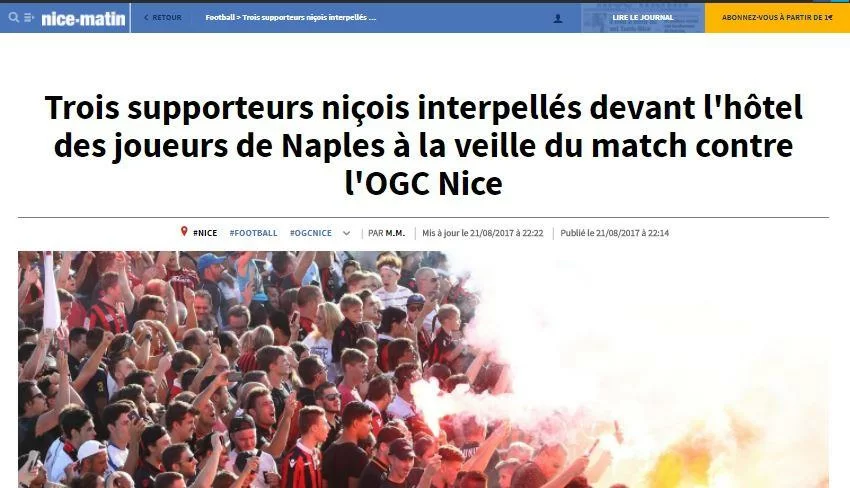 La partita tra Napoli e Nizza si prevede calda anche fuori dal campo. Secondo quanto riportato dal Nice Matin infatti già sono dovute intervenire le forze dell’ordine. Una dozzina di supporters francesi si sono radunati alla vigilia del match fuori l’hotel dove risiedono i calciatori azzurri.
