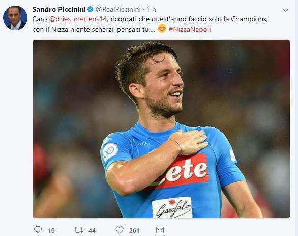 Queste le sue parole: “Caro @dries_mertens14, ricordati che quest’anno faccio solo la Champions, con il Nizza niente scherzi, pensaci tu….