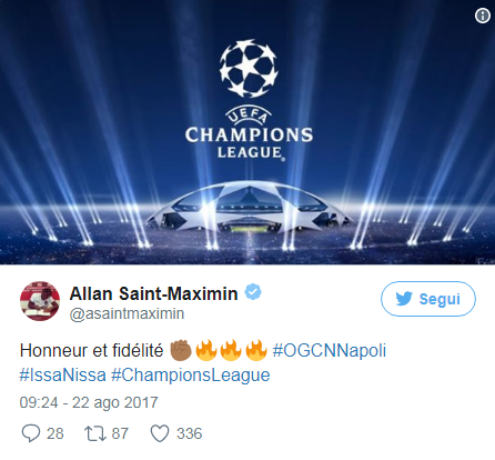 A suonare la carica per i suoi, in questo caso, ci ha pensato l’attaccante Allan Saint-Maximin che, attraverso un messaggio pubblicato su Twitter, incita i suoi compagni a rispettare l’impegno, un impegno fondamentale per tutta la città di Nizza. Di seguito, il tweet citato che recita: “Onore e fedeltà!”