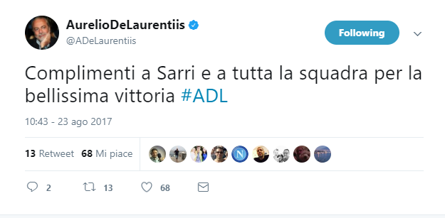 “Complimenti a Sarri e a tutta la squadra per la bellissima vittoria!”: è questo il messaggio consegnato su Twitter da Aurelio De Laurentiis.