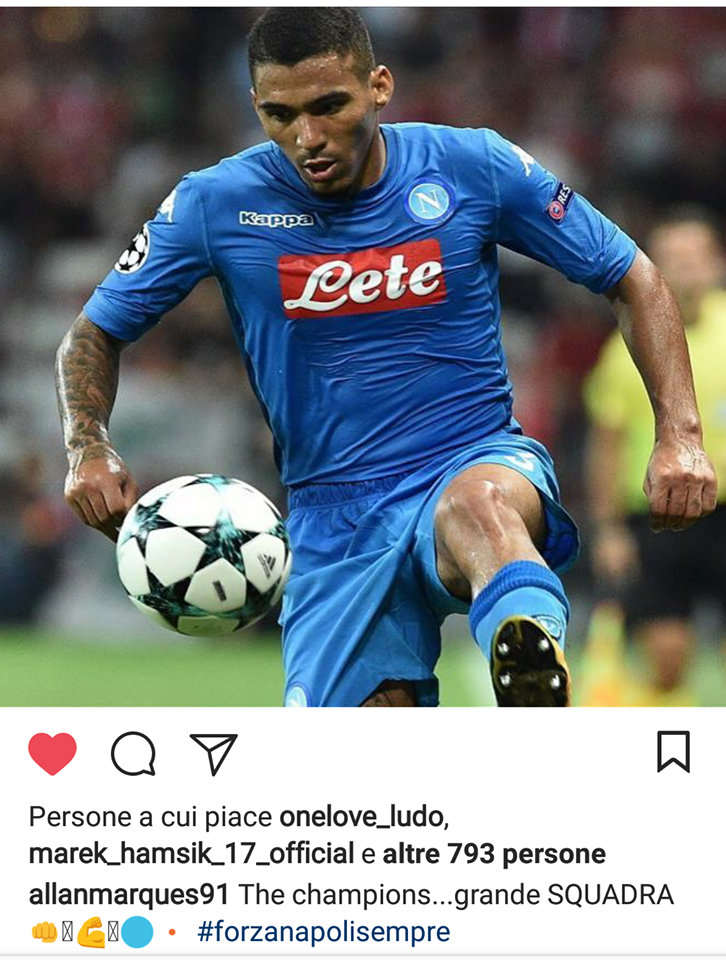 “The Champions… Grande SQUADRA!” scrive il centrocampista azzurro sul noto social network.