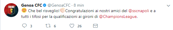 Il Genoa fa i complimenti al Napoli per la qualificazione in Champions e lo fa attraverso il proprio profilo Twitter: