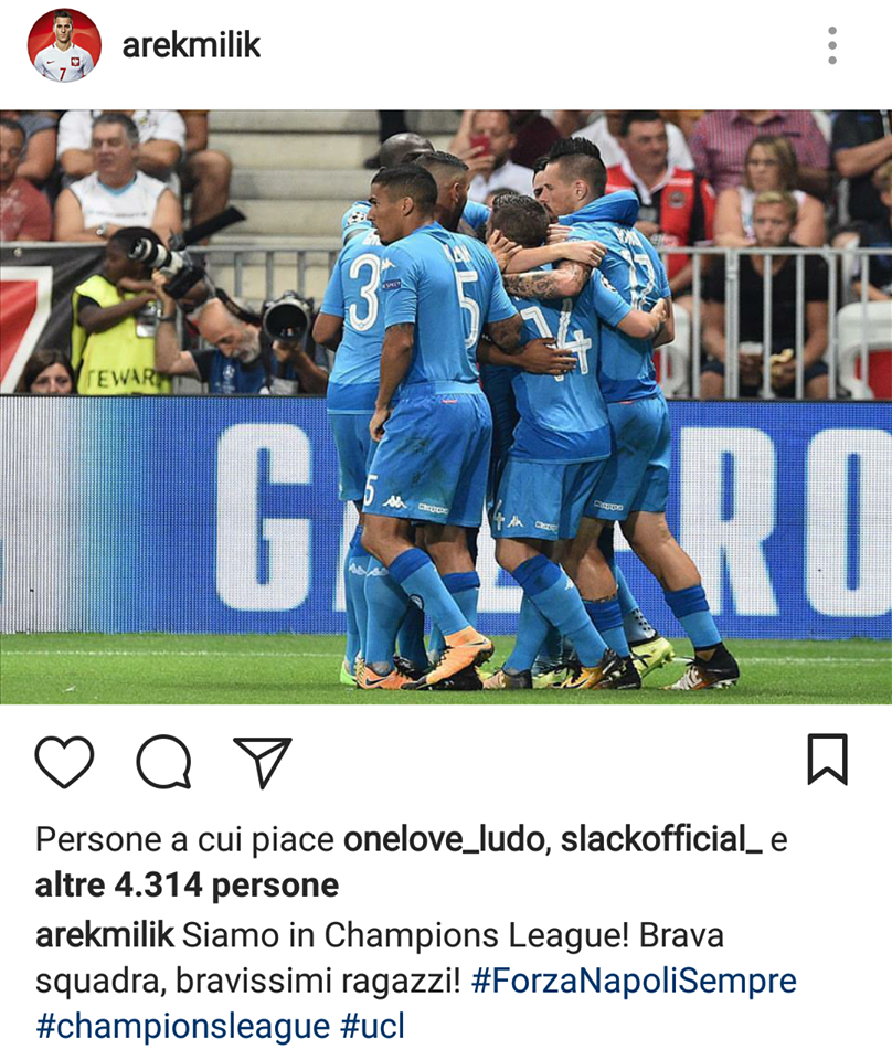 Arriva anche l’esultanza di Milik dopo la vittoria all’Allianz Riviera. Il passaggio del turno è stato celebrato dal polacco su Instagram: