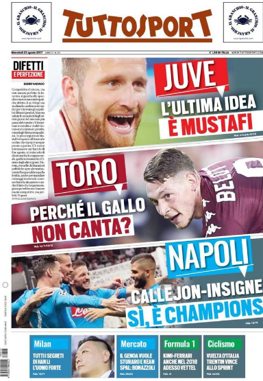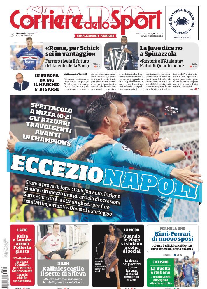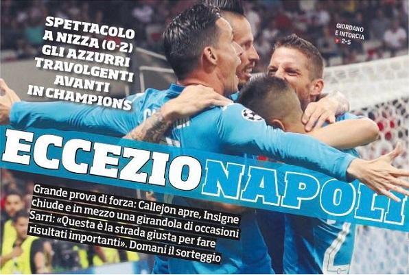 Nella loro edizione di domani, ci sarà spazio per gli azzurri su molte prime pagine. Anche L’Equipe, prestigiosi quotidiano francese, esalta il gioco di Sarri: “Nettamente dominato dal Napoli, il Nizza non è mai stato all’altezza di credere nell’exploit” Ecco alcune delle prime pagine di domattina: