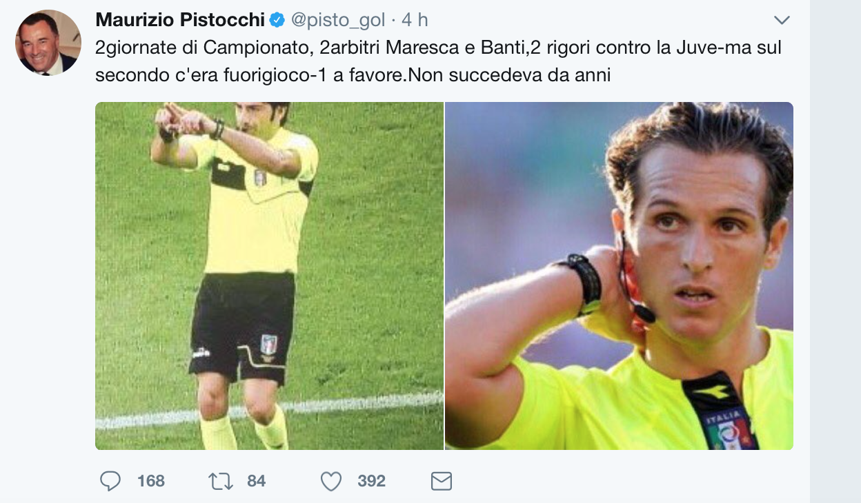 “Due giornate di campionato, due arbitri Maresca e Banti, due rigori contro la Juve (su quello a Genova c’era fuorigioco). Non succedeva da anni”.