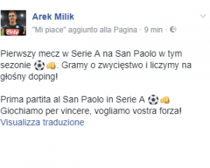 Milik con una foto pubblicata tramite i suoi social, si mostra carico per stasera, ed entusiasta della tifoseria che li aspetterà al San Paolo: “Giochiamo per vincere, vogliamo la vostra forza”.
