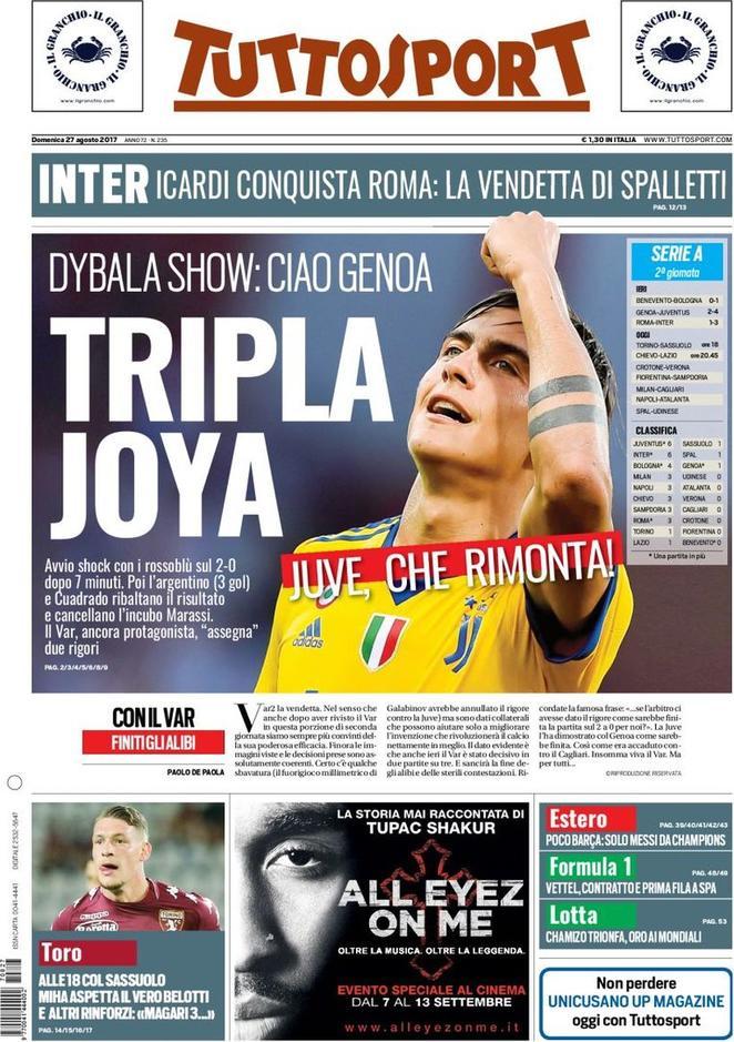 Ecco le prime pagine dei principali quotidiani sportivi, in edicola domattina. TuttoSport sofferma la propria attenzione sulla prestazione maiuscola di Paulo Dybala contro il Genoa. Il Corriere dello Sport, invece, analizza il grande exploit del Napoli, sottolineando come la squadra sia pronta a lottare su tutti i fronti possibili quest’anno. Di seguito, le pagine in anteprima.