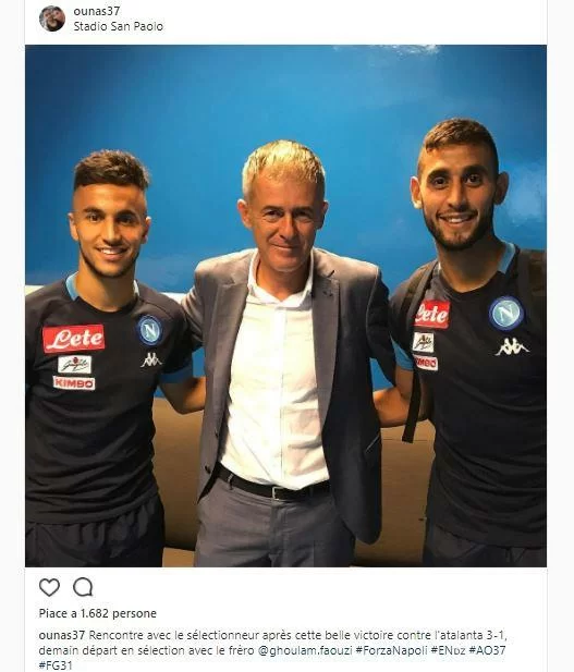 Attraverso il suo profilo Instagram, Adam Ounas ha voluto festeggiare la vittoria contro l’Atalanta con Faouzi Ghoulam e un ospite speciale. L’allenatore dell’Algeria infatti ha posato con i due calciatori in attesa di partire con la nazionale: “Rencontre avec le sélectionneur après cette belle victoire contre l’atalanta 3-1, demain départ en sélection avec le frèro @ghoulam.faouzi #ForzaNapoli #EN🇩🇿 #AO37#FG31” (Incontro con l’allenatore dopo la bella vittoria contro l’Atalant 3-1, domani si parte per la nazionale col fratello)