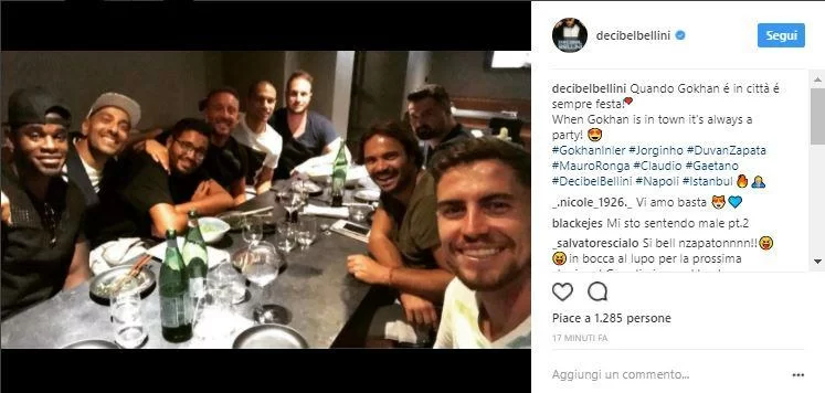 Dopo le solite foto di rito in giro per la città, la sera è stata riservata ad incontrare i vecchi amici. Jorginho e Daniele ‘Decibel’ Bellini, speaker ufficiale del Napoli, sono stati tra i protagonisti. Attraverso Instagram i giocatori hanno voluto condividere con i loro follower questo momento di divertimento.