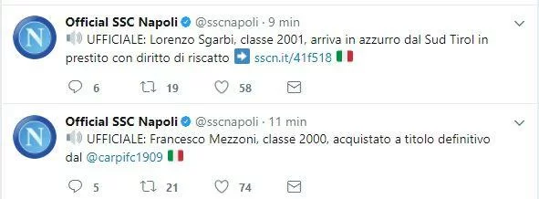 Attraverso il suo profilo Twitter, la SSC Napoli ha ufficializzato l’acquisto di due giovani calciatori. Del primo, Francesco Mezzoni, è già stata data l’anteprima. Attaccante classe 2000 direttamente dal Carpi, preso a titolo definitivo.