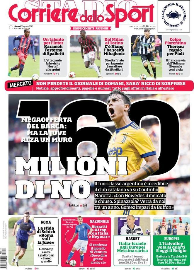 Il Corriere dello Sport apre con: “160 milioni di no, mega offerta del Barca: ma la Juve alza un muro“. il riferimento è per un’offerta del Barcellona per Dybala. In taglio alto spazio invece per Karamoh, sempre più vicino all’Inter che ci prova anche per Mustafi.