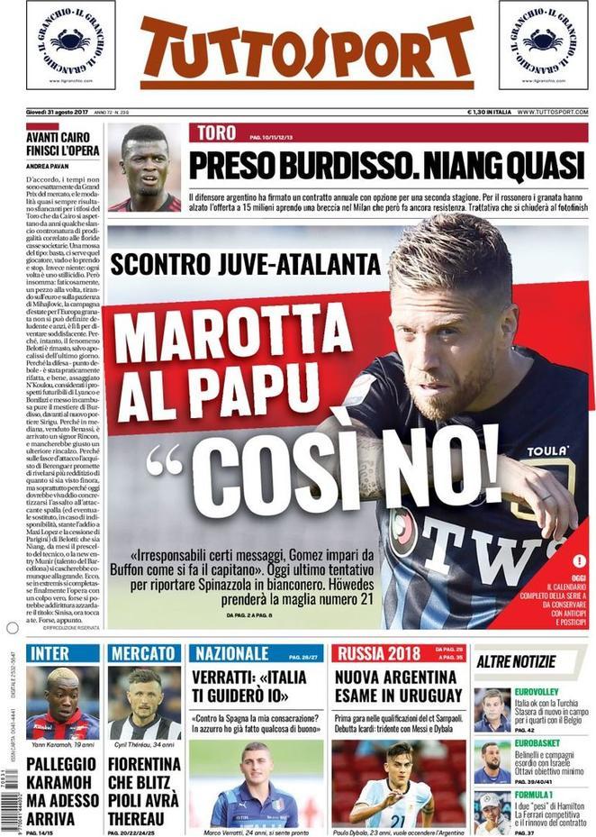 L’apertura di Tuttosport, invece, è dedicata allo scambio di vedute a distanza tra Marotta e Gomez: “Marotta al Papu: così no“. In taglio spazio al mercato del Toro: “Preso Burdisso, Niang quasi“.