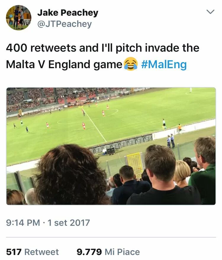 Durante il match, questo ragazzo ha deciso di dare un tocco di allegria in più alla serata, facendo una sfida su twitter: “A 400 retweets scenderò in campo per fare invasione durante l’incontro tra Inghilterra e Malta”