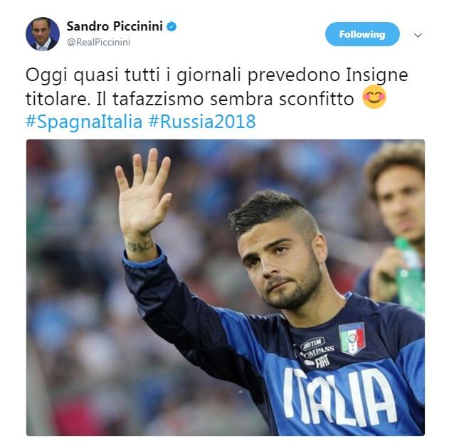 Ebbene, secondo le ultime notizie, pare che Lorenzo Insigne venga schierato titolare dal CT Ventura. La scelta è piaciuta al noto telecronista Sandro Piccinini che su Twitter si lascia andare ad un messaggio misto tra la gioia per la presenza del napoletano in campo, e un pizzico di polemica per chi aveva pensato di escluderlo: “Oggi quasi tutti i giornali prevedono Insigne titolare. Il tafazzismo (masochismo, ndr) sembra sconfitto 😊#SpagnaItalia #Russia2018“.