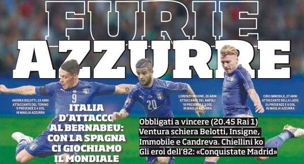 Le prime pagine sportive dei quotidiani che troveremo tra poche ore in edicola, si concentrano perlopiù sulla decisiva partita che l’Italia giocherà in Spagna per le qualificazioni al mondiale di Russia 2018.