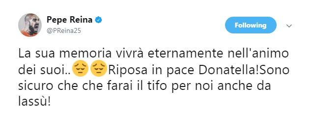 Reina, evidentemente venuto a conoscenza della notizia, ha voluto dedicare un pensiero alla donna, scrivendo un bellissimo messaggio sul suo profilo Twitter: “La sua memoria vivrà eternamente nell’animo dei suoi..😔😔Riposa in pace Donatella!Sono sicuro che che farai il tifo per noi anche da lassù!“.