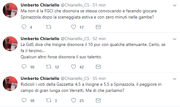 “Ridicoli i voti della Gazzetta, Insigne il peggiore in campo insieme a Verratti. Ma di che parliamo? La Gds dice che Insigne disonora la numero 10. Certo, se fa il terzino…