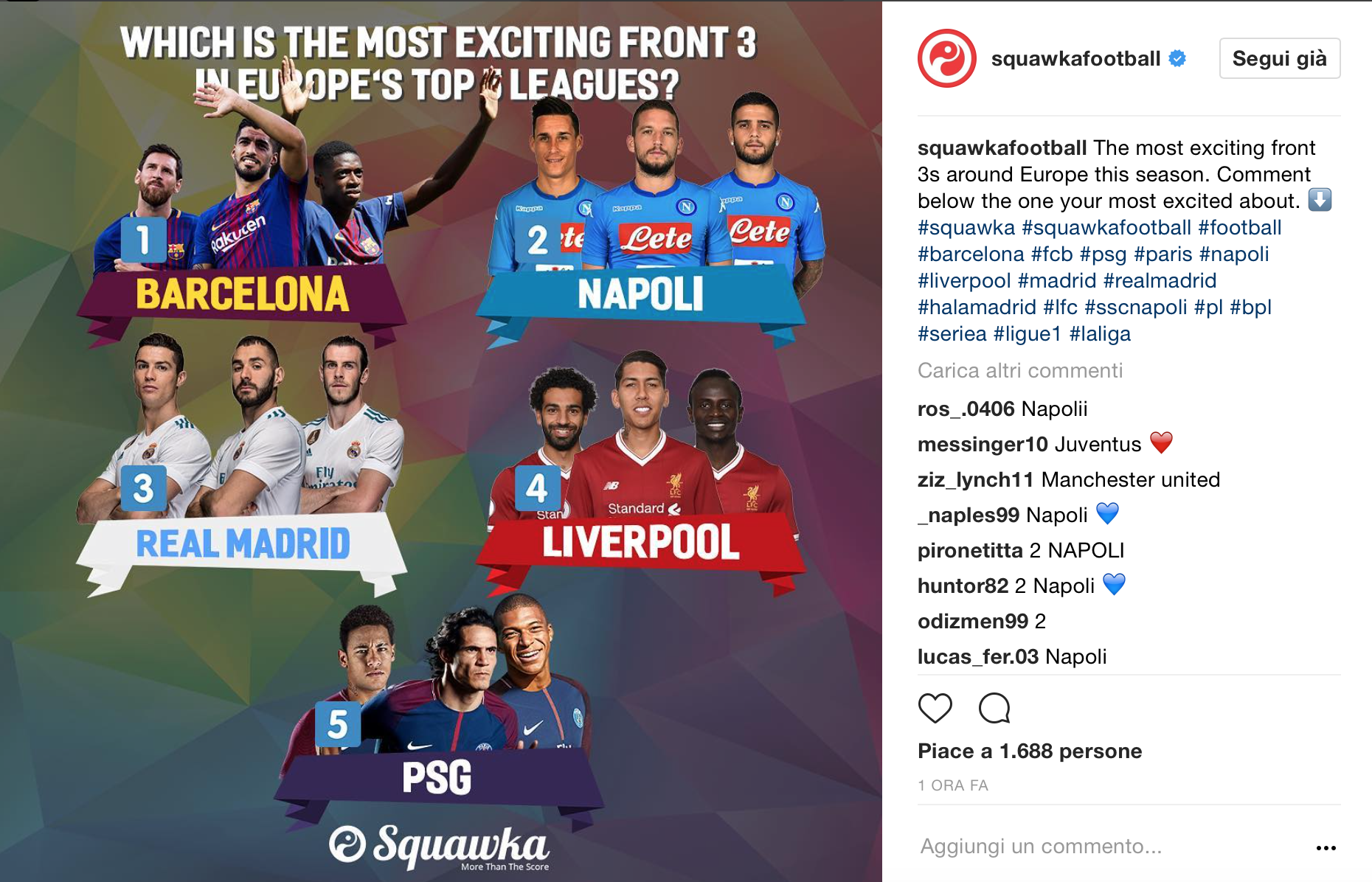 Altra testimonianza arriva da un sondaggio lanciato da Squawka, sito di informazione calcistica, che su Instagram interroga i seguaci su quale sia il tridente più pericoloso in Europa.