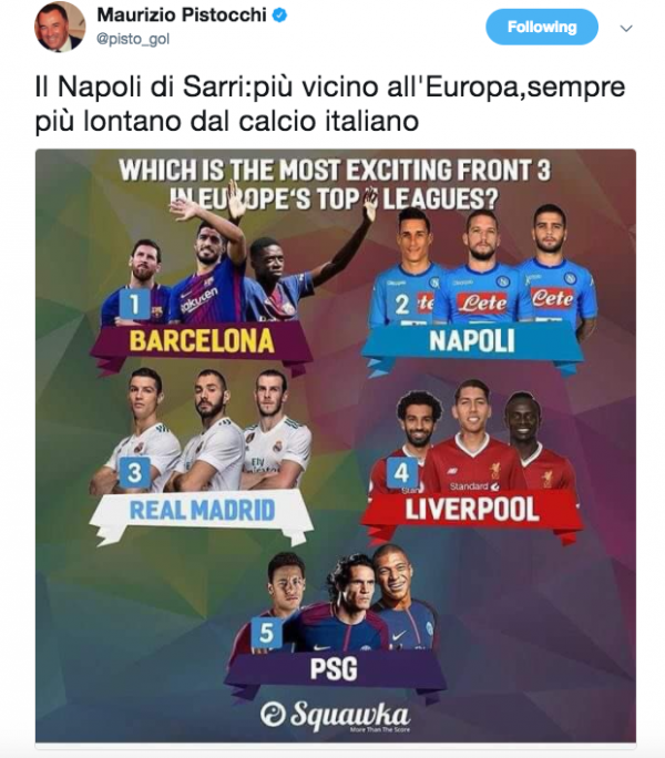 Il giornalista Maurizio Pistocchi, attraverso Twitter, ha scritto: “Il Napoli di Sarri: più vicino all’Europa, sempre più lontano dal calcio italiano”, con a corredo la foto che ritrae il tridente azzurro insieme a quelli di Barcellona, Real Madrid, PSG e Liverpool.