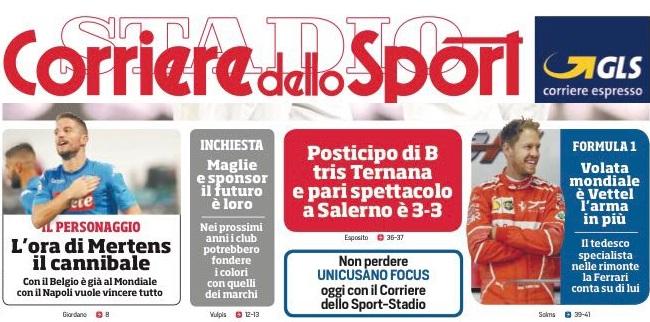 Il Corriere dello Sport titola “Ricominciamo“. “L’Italia con Israele, serve subito il rilancio nella corsa ai Mondiali“. Tavecchio commenta l’eventuale eliminazione: “Sarebbe un disastro“. Spazio anche alle parole di Spalletti su Icardi: “Un grandissimo“, e Karamoh: “Che bravo!“. Poi spazio all’elezione di Andrea Agnelli alla presidenza dell’Eca. Il personaggio è invece Dries Mertens: “L’ora del cannibale“.