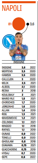 Stamane La Gazzetta dello Sport ha analizzato il monte ingaggi di tutte le compagini del campionato cadetto, evidenziando di come il costo totale superi il miliardo di euro. Nello specifico del Napoli il calciatore più pagato è Lorenzo Insigne, il quale guadagna 3.6 milioni di euro a stagione. Completano il podio Marek Hamsik e Dries Mertens.