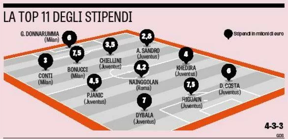 Tra i pali, con i suoi 6 milioni a stagione, c’è Gigio Donnarumma. Difesa a quattro con i due neo-rossoneri Conti (3 milioni) e Bonucci (7,5) e due bianconeri Chiellini (3,5) e Alex Sandro (2,8).